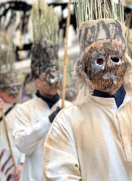 Waggis: Leute, die in einem blauen Hemd, weisse Hosen und einem roten Schal verkleidet sind. Zudem tragen sie eine typische Larve, haben Holzschuhe an und werfen Süssigkeiten und Orangen von ihrem Wagen.