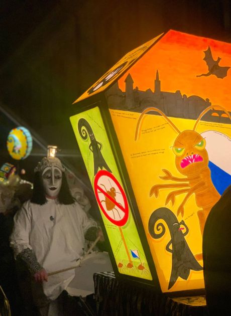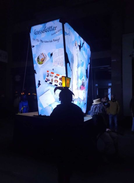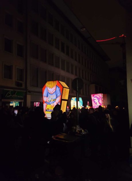 Ladärne: Laterne mit dem aktuellen Thema (Sujet) der Clique. Die Laternen werden von Montagabend bis Mittwochmorgen auf dem Münsterplatz ausgestellt.